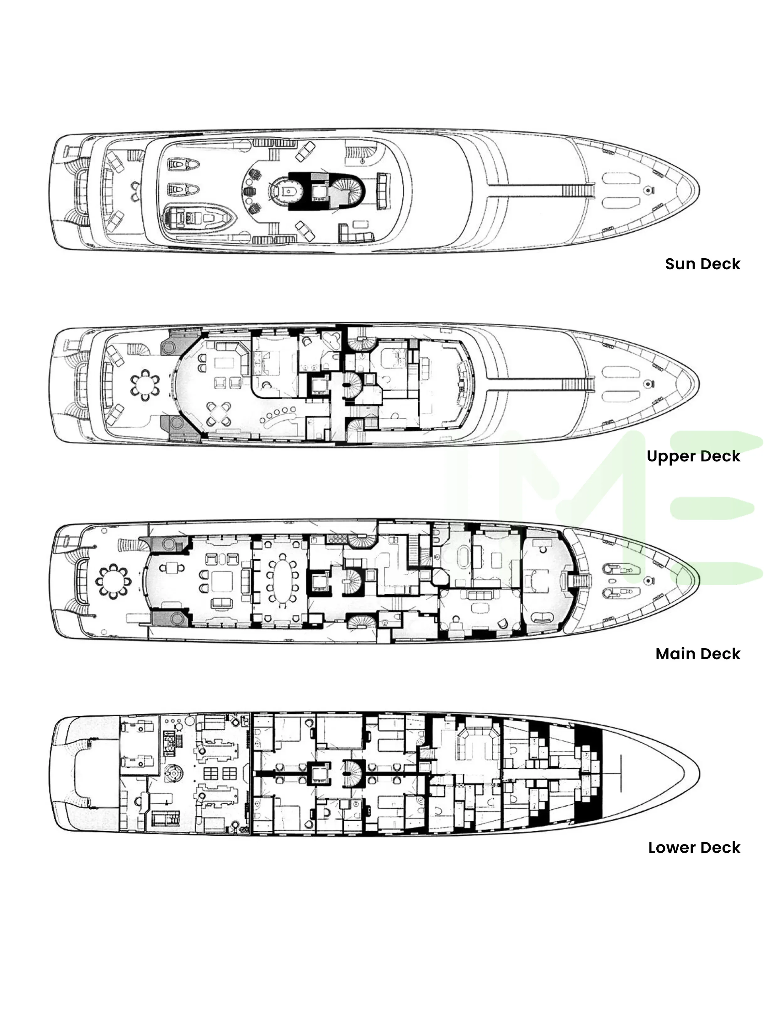 Request plans that include the layout of staterooms, guest areas, and outdoor spaces, as well as crew quarters and work areas.