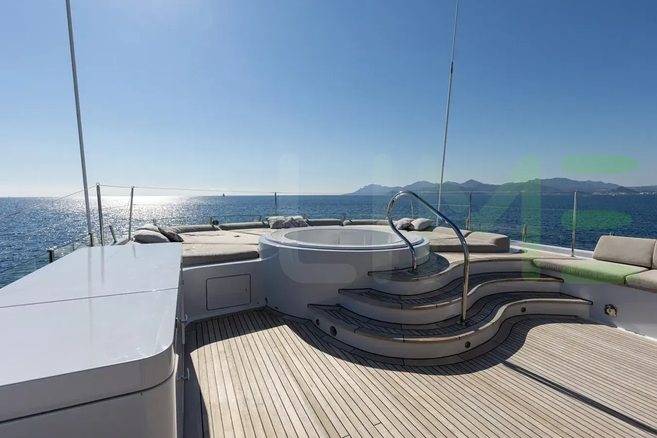 Her features include underwater lights, beach club, deck jacuzzi, WiFi and air conditioning.