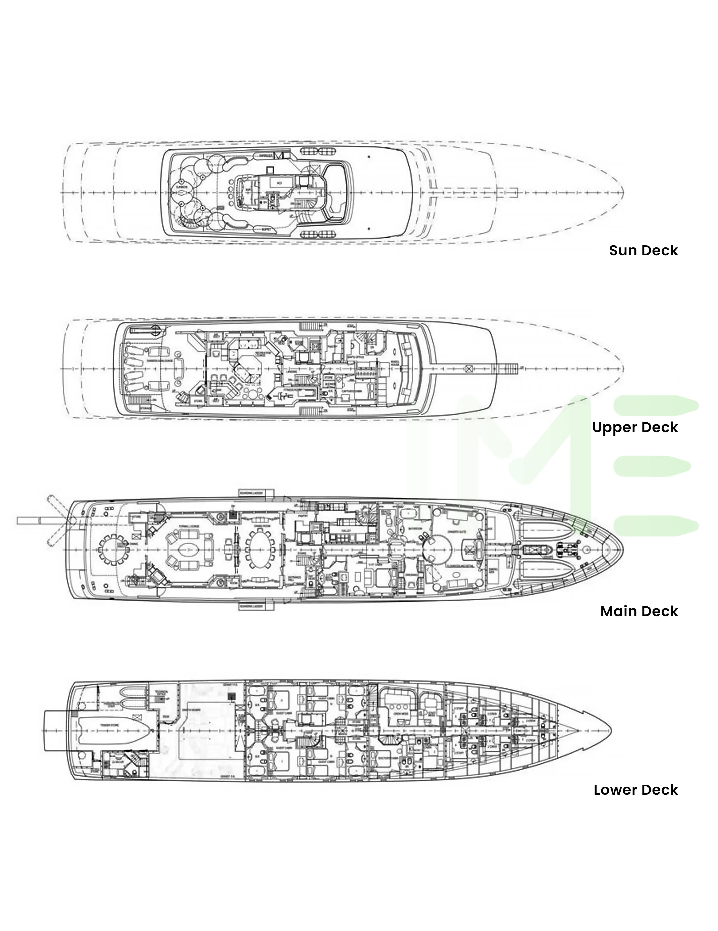 Request plans that include the layout of staterooms, guest areas, and outdoor spaces, as well as crew quarters and work areas.