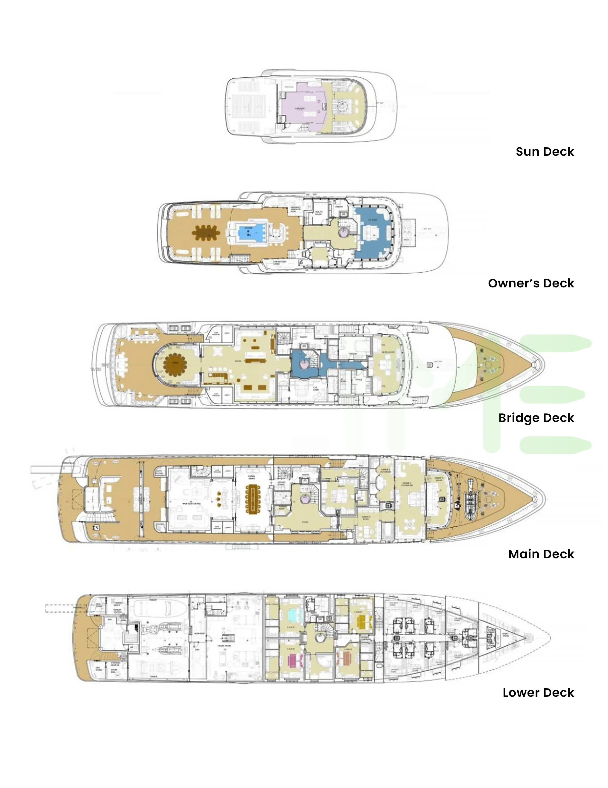 Request plans that include the layout of staterooms, guest areas, and outdoor spaces, as well as crew quarters and work areas.