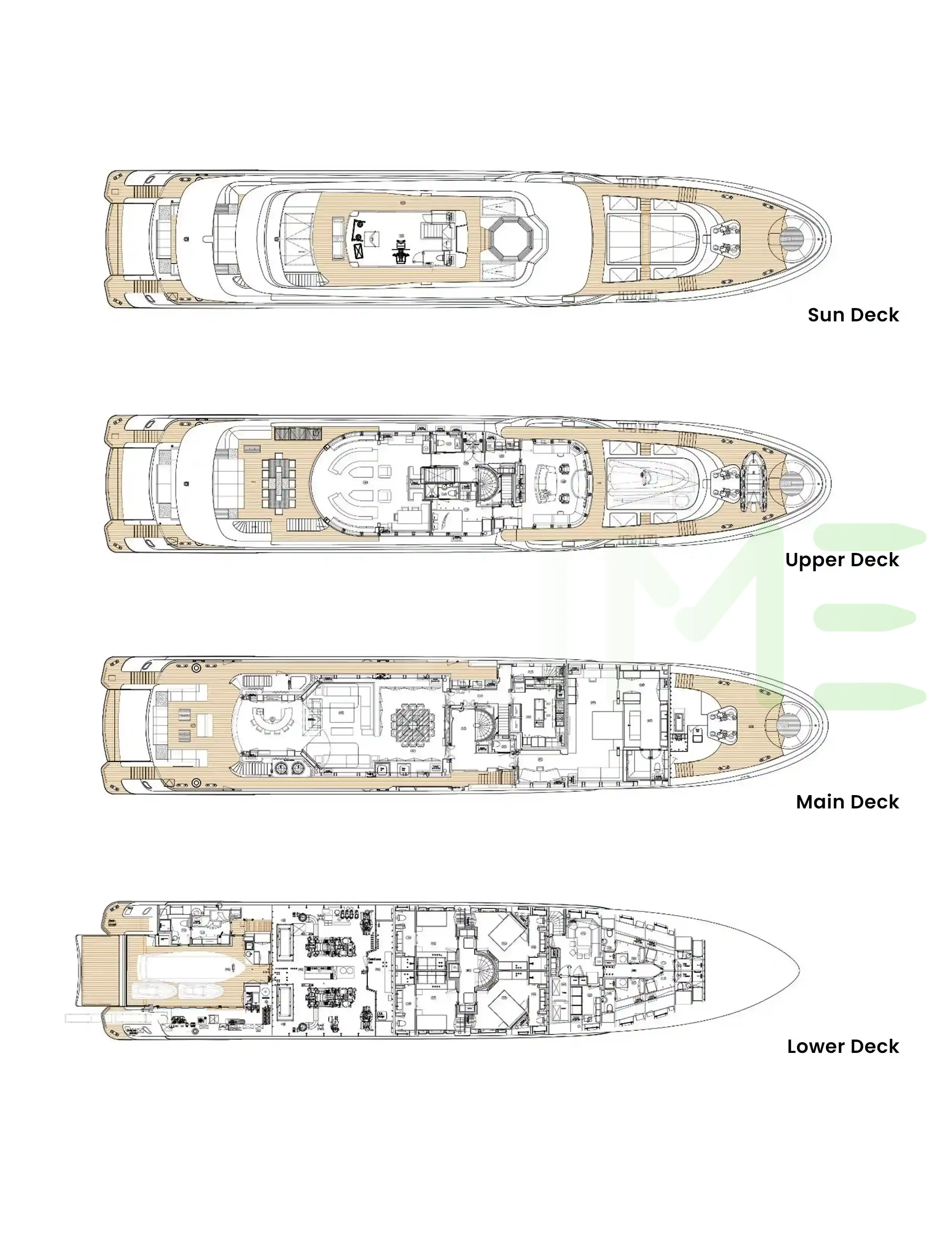 Request plans that include the layout of staterooms, guest areas, and outdoor spaces, as well as crew quarters and work areas.