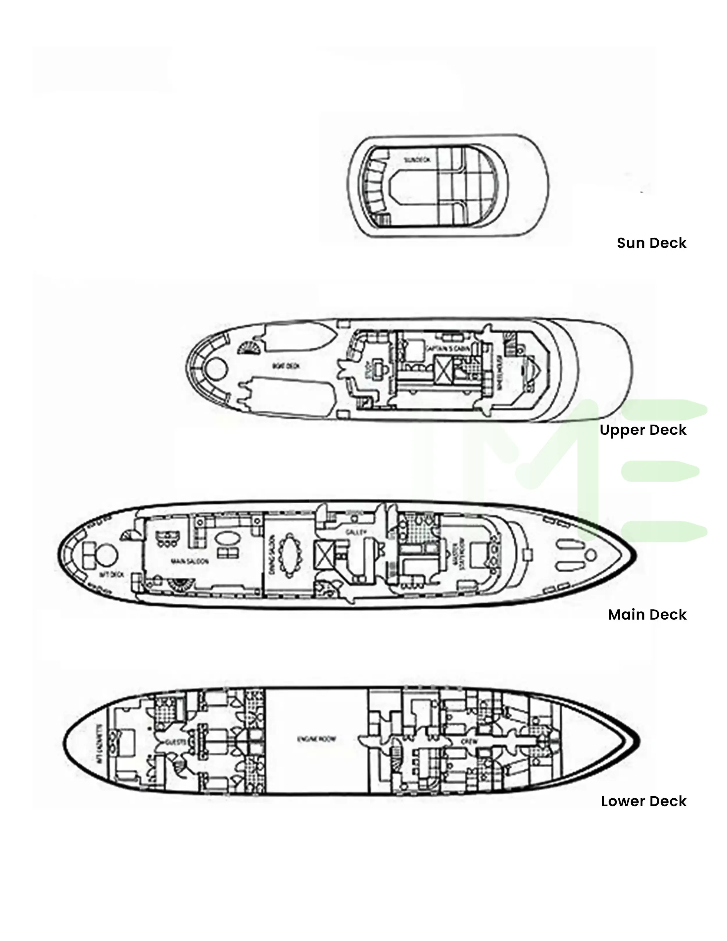 Request plans that include the layout of staterooms, guest areas, and outdoor spaces, as well as crew quarters and work areas.