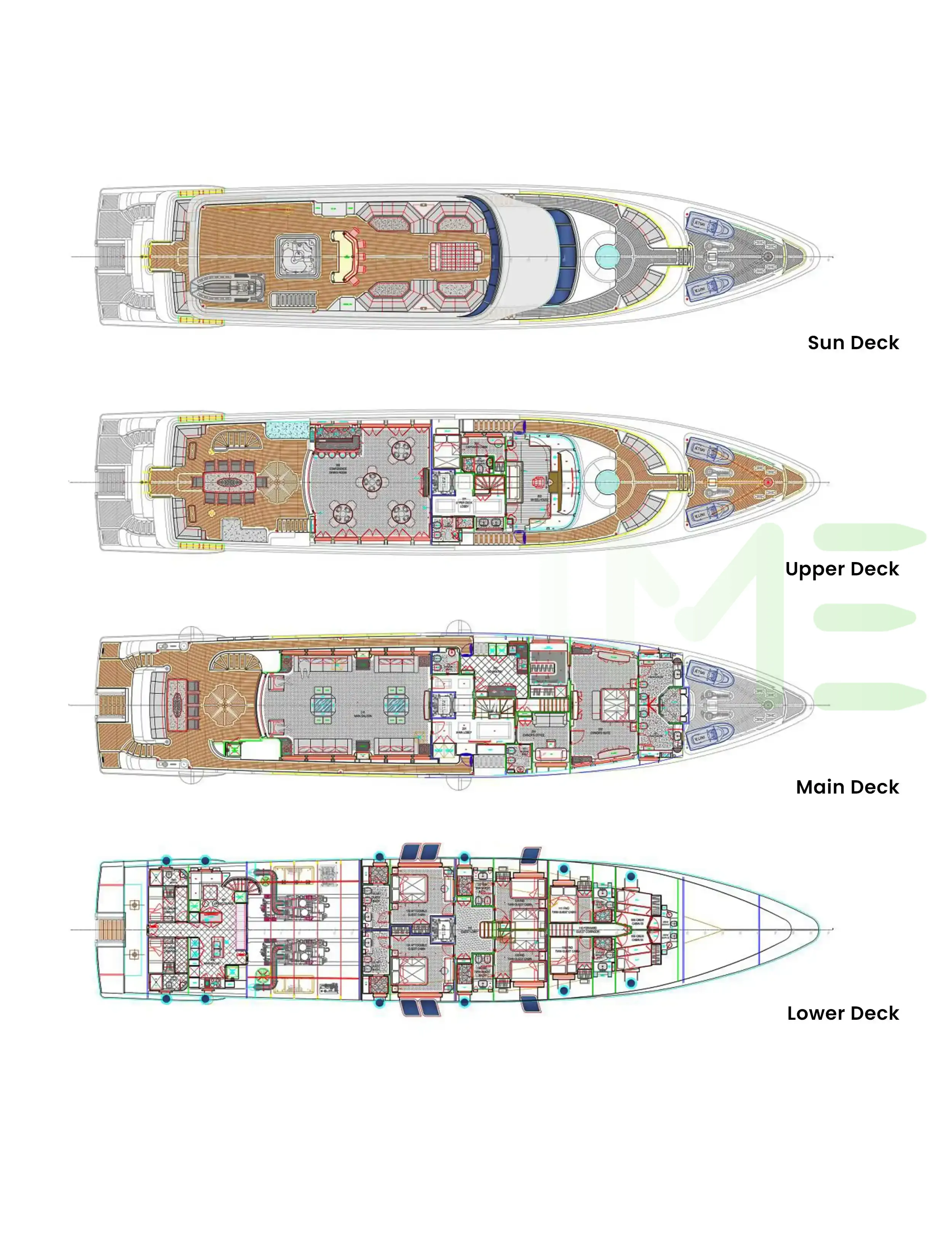 Request plans that include the layout of staterooms, guest areas, and outdoor spaces, as well as crew quarters and work areas.