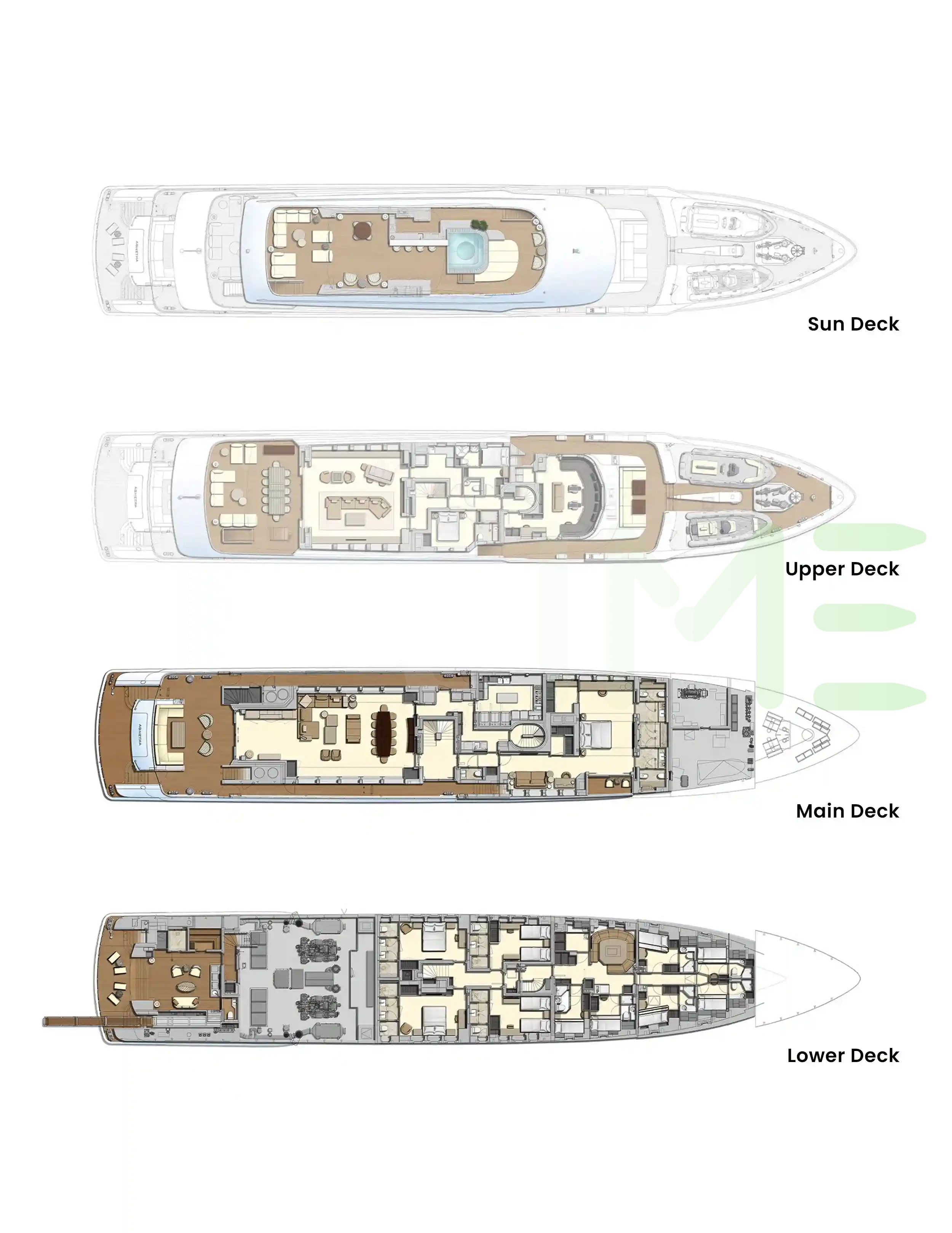 Request plans that include the layout of staterooms, guest areas, and outdoor spaces, as well as crew quarters and work areas.