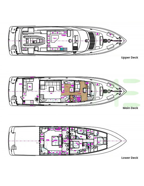 Request plans that include the layout of staterooms, guest areas, and outdoor spaces, as well as crew quarters and work areas.