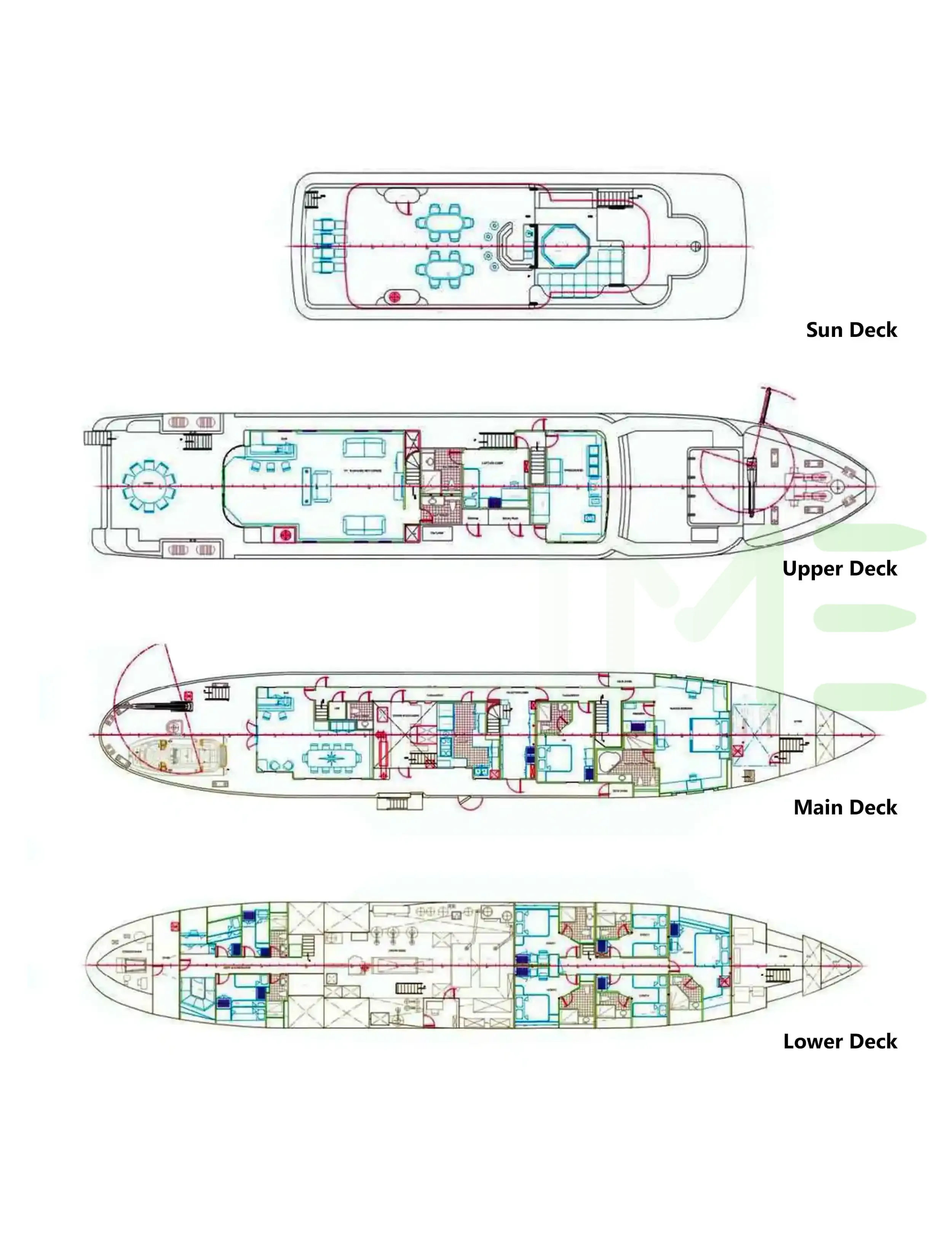 Request plans that include the layout of staterooms, guest areas, and outdoor spaces, as well as crew quarters and work areas.