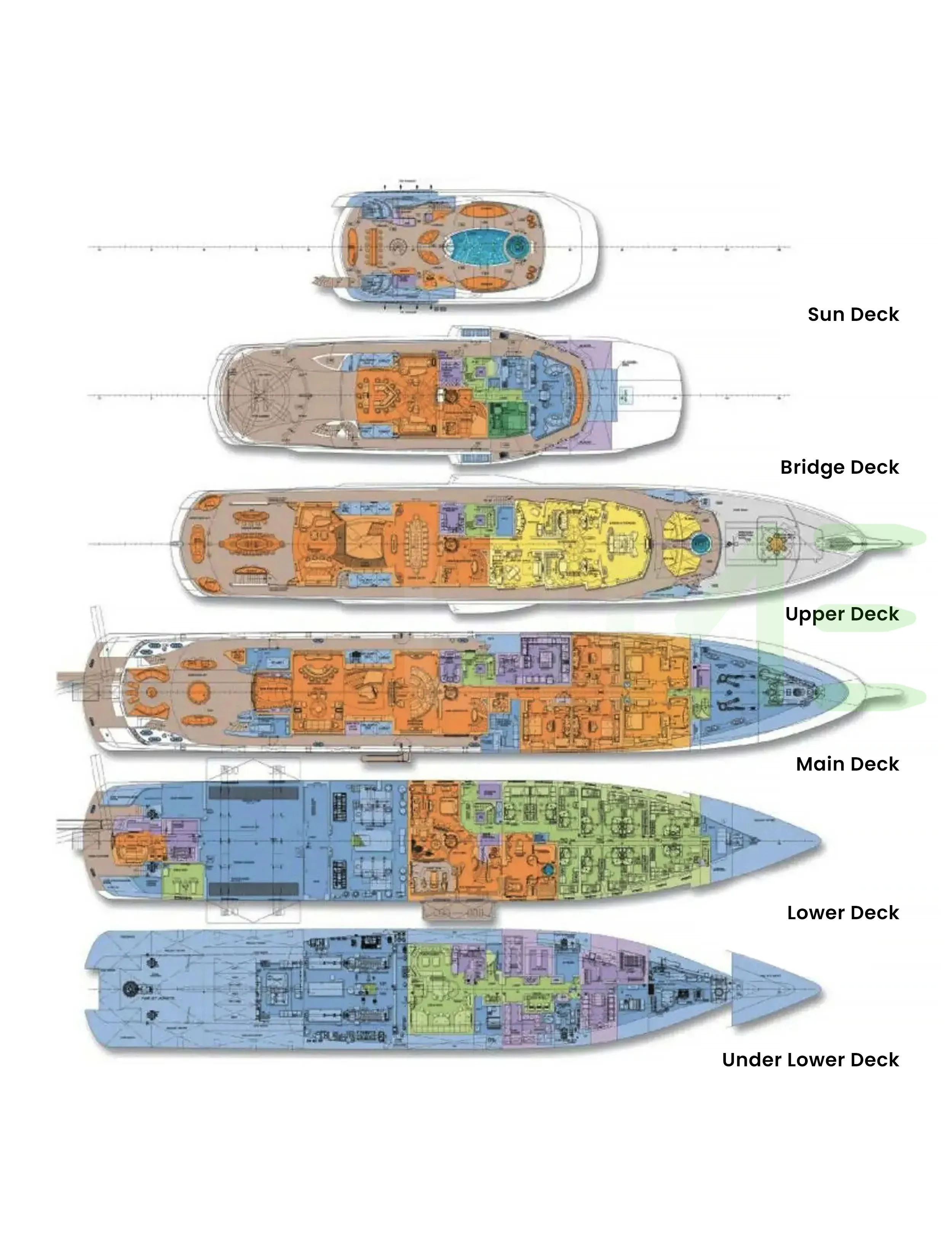 Request plans that include the layout of staterooms, guest areas, and outdoor spaces, as well as crew quarters and work areas.